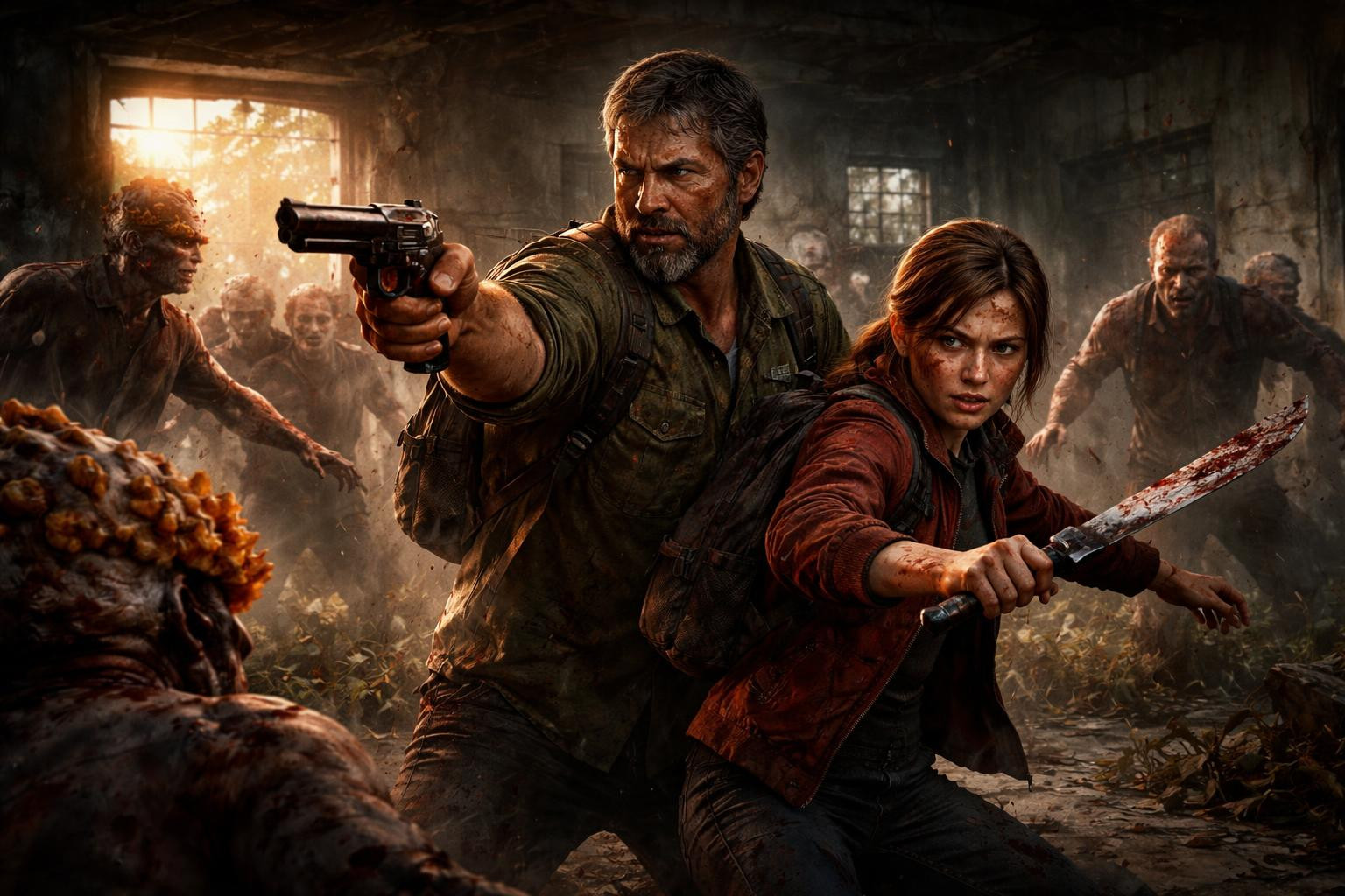Обложка для игры Одни из нас: Часть I, Джоэл и элис отбиваются от зараженных
