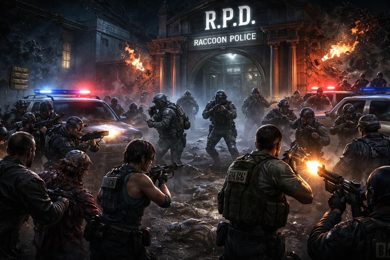 uss солдаты амбреллы пытаются отбить полицейский участок у полицейских racoon city, отряд STARS совместно с rpd полицией города пытаются отпросить их попутно отбиваясь от зомби