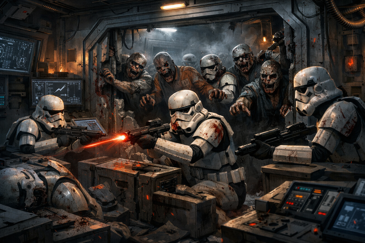 звездные войны, несколько штурмовиков остались в живых и заперлись в командном центе отбиваясь от зомби, некогда своих братьев штурмовиков и других работников комплекса, без текста