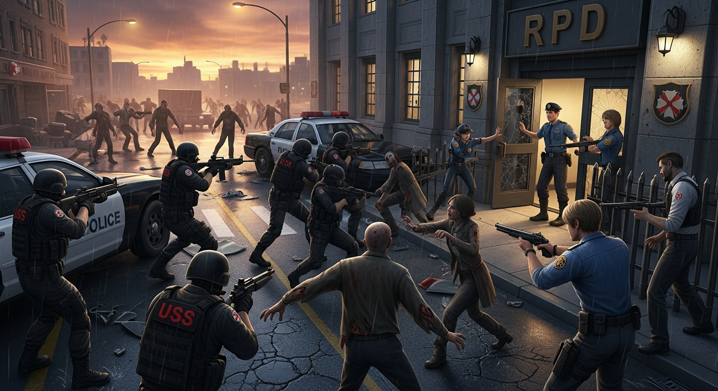 uss солдаты амбреллы пытаются отбить полицейский участок у полицейских racoon city, отряд STARS совместно с rpd полицией города пытаются отпросить их попутно отбиваясь от зомби