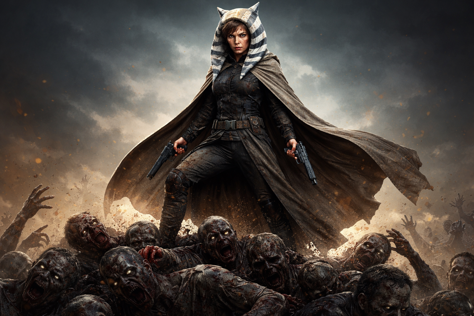 Элис из обителя зла стоит с двумя пистолетами в плаще асоки тано, на горы из тупов зомби