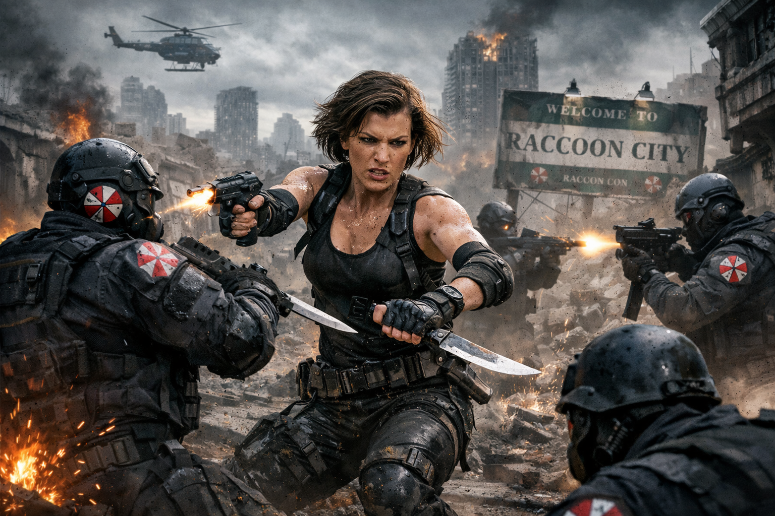 элис из обителя зла сражается с солдатами амбреллы uss на фоне разрушенного raccoon city