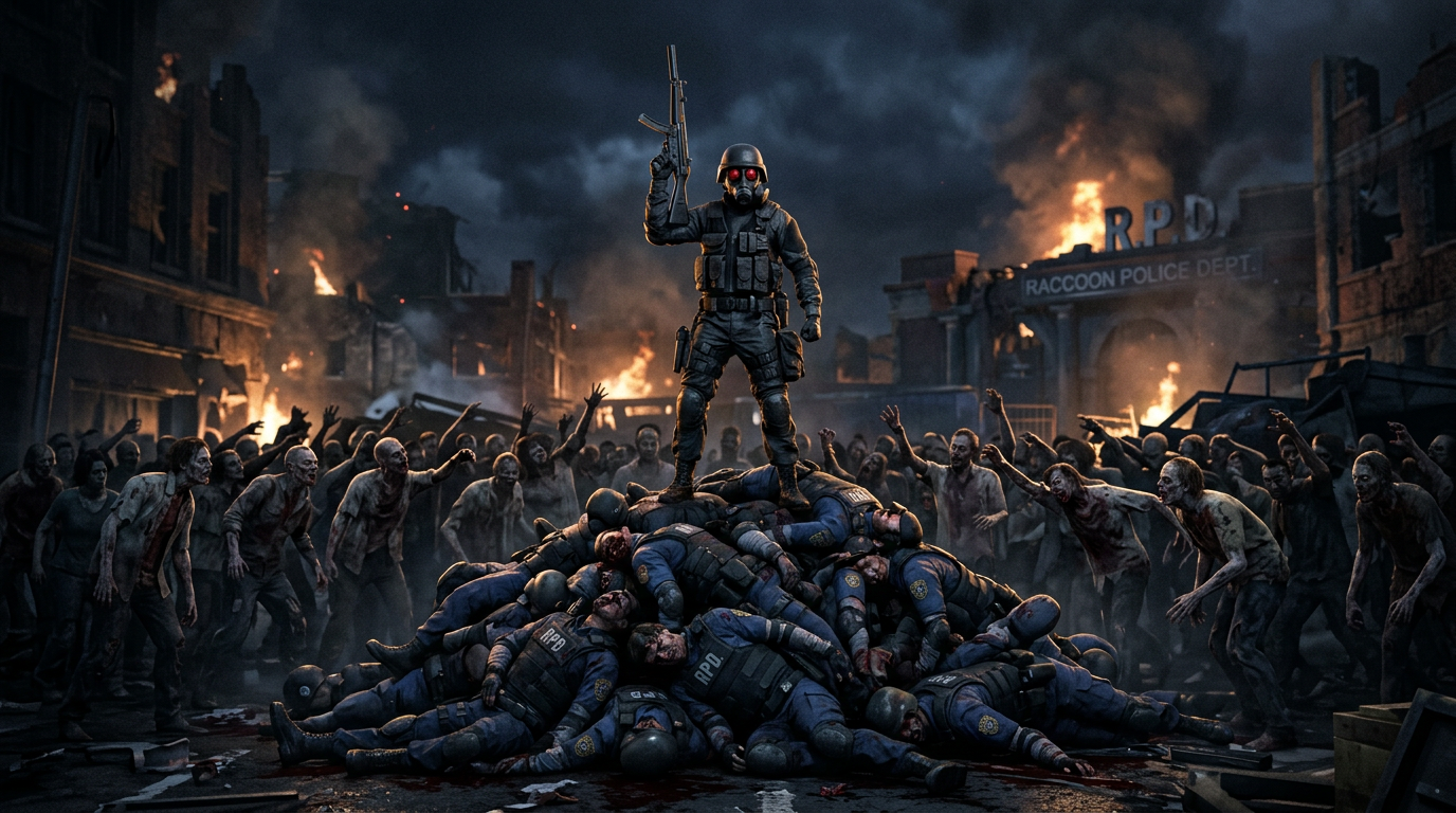Ханк стоит на горе трупов полицейских из ракун сити с автоматом поднятым в верх и вокруг него зомби